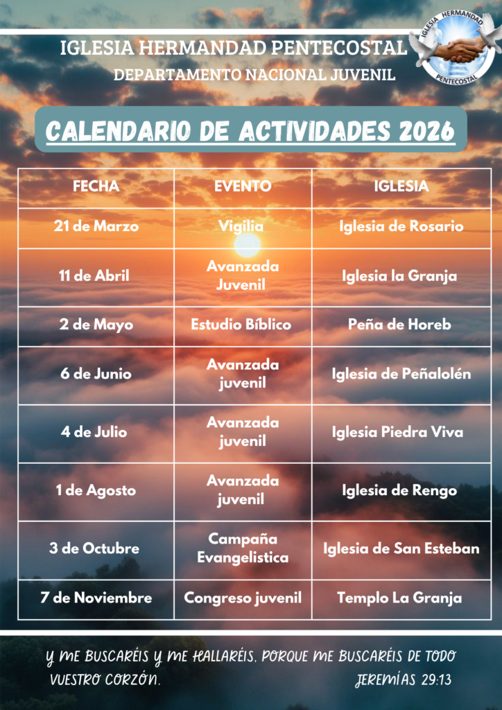 Como Departamento Juvenil de la Iglesia Hermandad Pentecostal, realizamos eventos nacionales cada mes en nuestros templos. Estas instancias son organizadas y dirigidas por nuestros propios jóvenes, quienes con dedicación y compromiso preparan cada actividad.